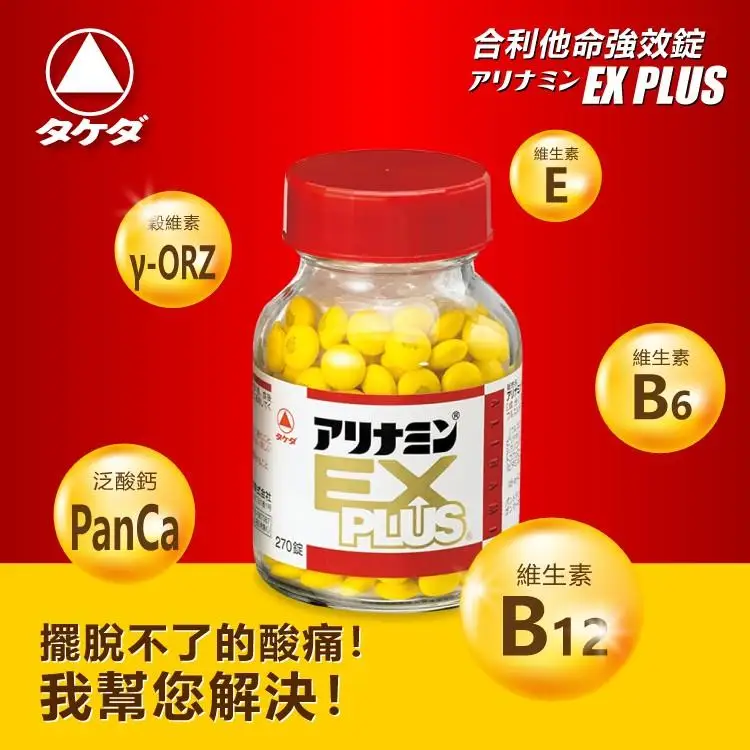 當出現眼睛疲勞、肩膀僵硬、腰酸背痛…等情形時,許多日本人都知道服用「合利他命EX PLUS強效錠」可以有效獲得緩解。「合利他命EX PLUS強效錠」當中含有「維生素B1誘導體呋喃硫胺」,可幫助產生減緩上述症狀的所需能量。維生素B1誘導體呋喃硫胺是「武田藥品工業株式會社」獨自開發的成果。「合利他命EX PLUS強效錠」為便於入口的黃色糖衣錠,每天1次,每次2~3錠,在飯後配開水服用即可(未滿15歲請勿服用)。